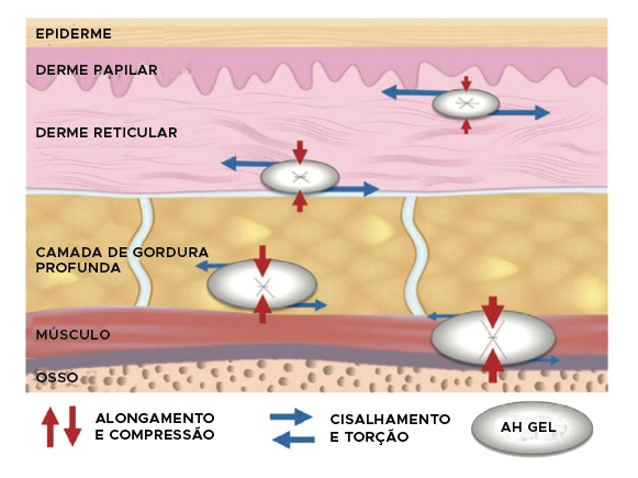 Após a injeção, os preenchedores de ácido hialurônico (AH) são submetidos a compressão, cisalhamento, alongamento, torção por movimentos musculares, peso dos tecidos moles, pressão em superfícies externas e força gravitacional.